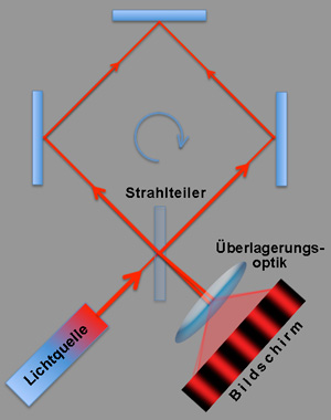 | Ausgehend von einer Lichtquelle (heutzutage ein Laser) trifft ein Lichtstrahl auf einen Strahlteiler; die Teilstrahlen durchlaufen in entgegengesetzter Richtung die Spiegelanordnung und werden nach einem Umlauf am Strahlteiler wieder ausgekoppelt und zu einem Interferenzstreifenmuster überlagert. |